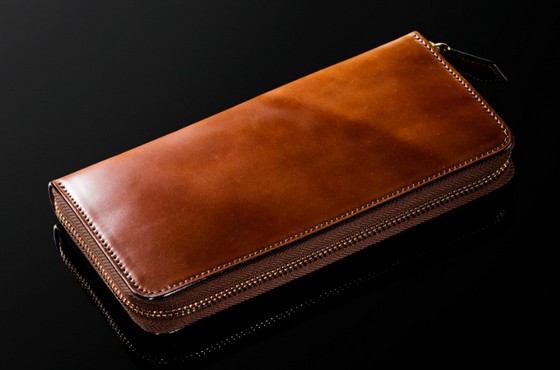米国ホーウィン社のシェルコードバンを使用した、ラウンドタイプの長財布です。内装を含め全面コードバンの最上級仕様で、とてもきめ細やかで美しい輝きを放っています。コードバンというとブラックという印象がありますが、他にも写真のようなウィスキー、グリーン、ネイビーブルーなど様々なカラー展開があるのが嬉しいです。