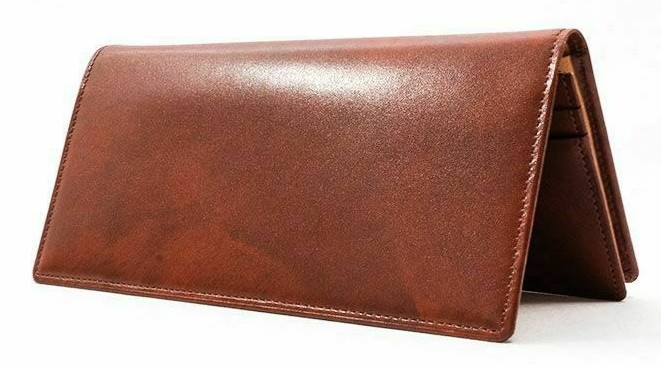 こちらはブライドルレザーとイタリアンレザーの組み合わせの、折り畳みタイプの長財布です。白いヌメ革と違って落ち着いた大人の雰囲気があります。マチが通っていないので若干薄型になります。